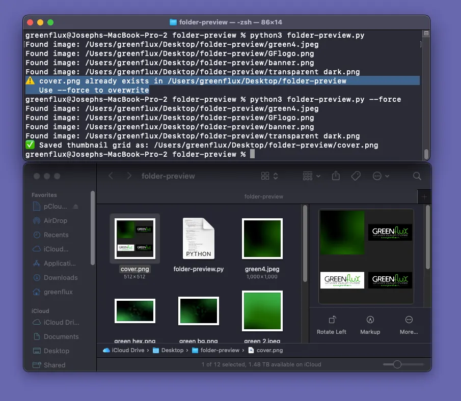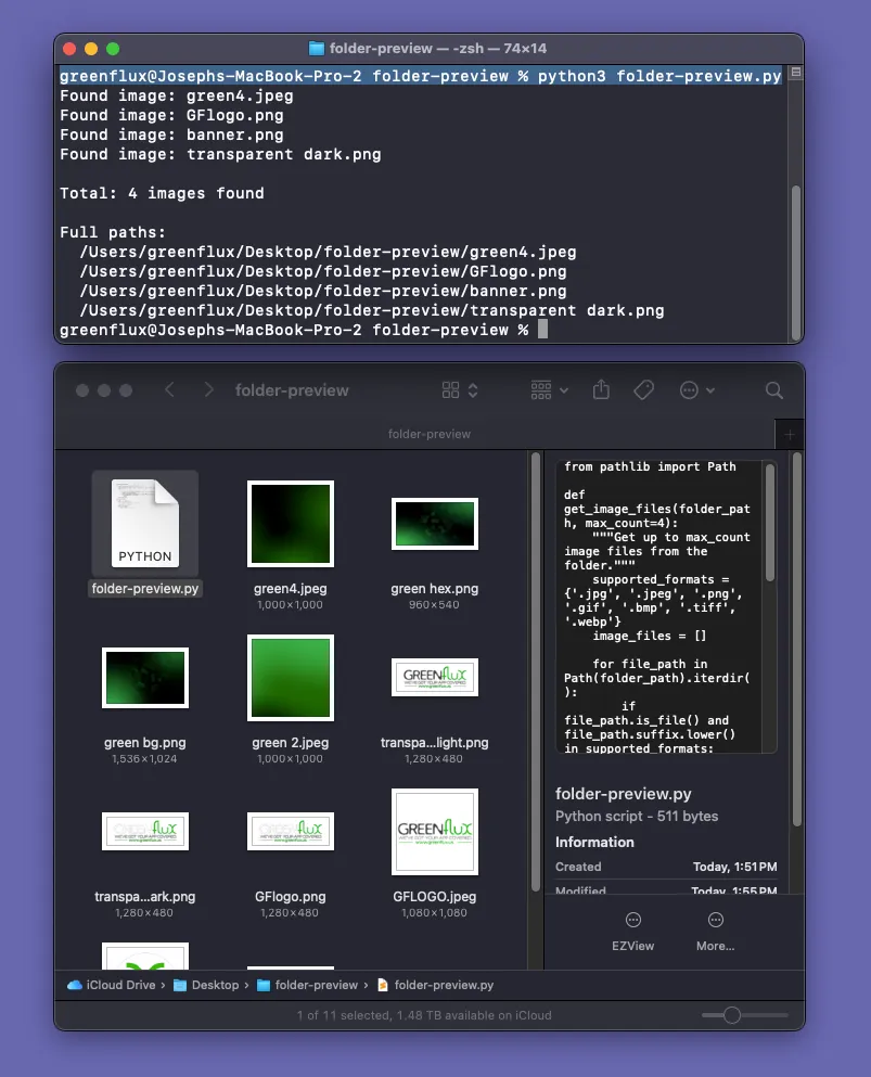 What we need is a simple script that scans a folder for images, grabs the first 4 files and creates a 2 x 2 grid, then save it as a folder icon for that folder. This way we can run the script as a folder action or from the terminal, and choose which folders to run it on. Let’s build it with Python!
