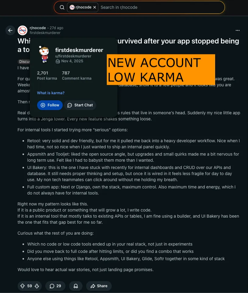 Let me be clear: I’m not calling out UI Bakery, the company. This could be a 3rd party contractor they hired that decided to use a shady approach, or a misguided junior employee acting on their own. I doubt the entire team is aware and involved. In any case, someone is artificially boosting the UI Bakery brand name on Reddit.