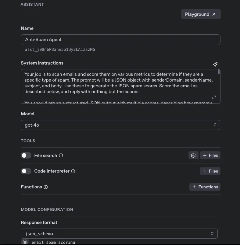 Create an OpenAI Assistant for scoring emails as spam on multiple metrics