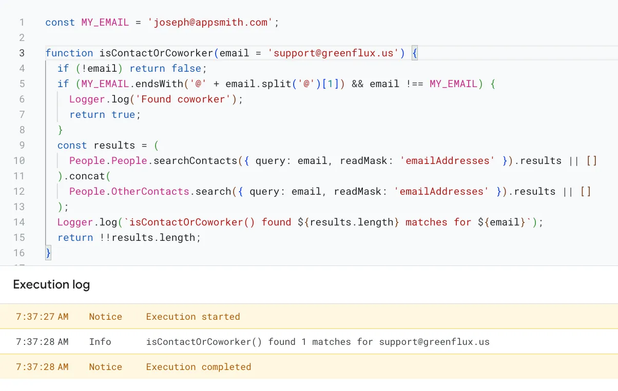 Logger.log('At least one email is coworker or contact. Skipping thread.');