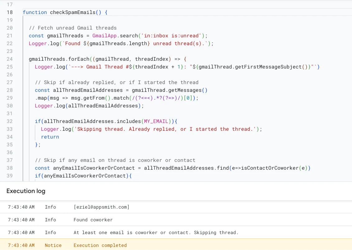 Depending on how many spam emails you get, you may start to run into usage limits, or quotas, on the Google APIs for Gmail and People (contacts). Once you start to hit those limits, you’ll have to migrate to using the REST API, which requires creating a project in Google and adding your credit card. At that point, you’ll have to write a LOT more code to handle constructing all the API calls, error checking, etc. So it makes more sense to switch platforms at this point, and using something like Appsmith to manage all the APIs and async JavaScript. But for lower volume, personal use, Apps Script works great and is free!