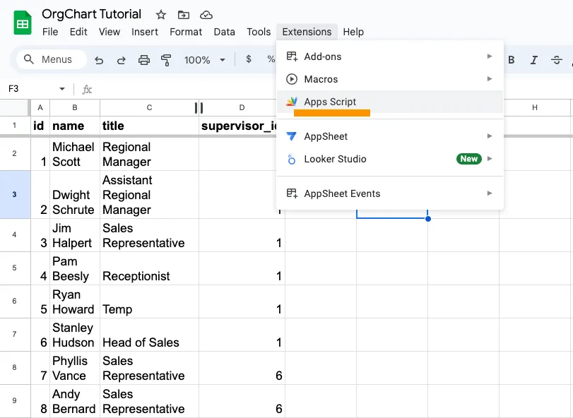 Start out by opening Apps Script from the Extension menu of the sheet with your employee data. In this case I have a sheet with each employee’s id, and a column for supervisor_id.