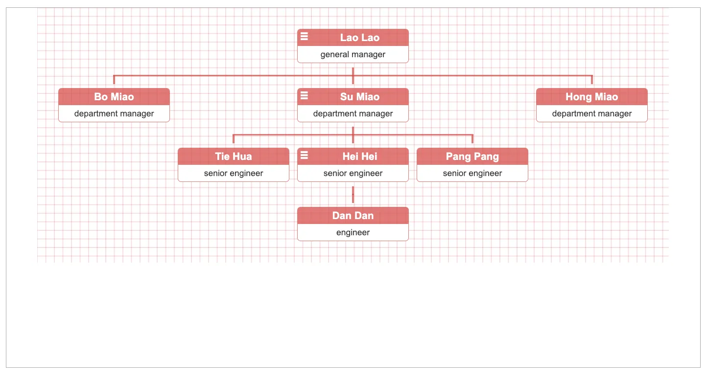 However, most organizations tend to have this same data in a database or spreadsheet format, with a column for the supervisor’s name or ID. And with a little JavaScript, this data can be used to create a data-driven org chart that updates itself when the data changes!
