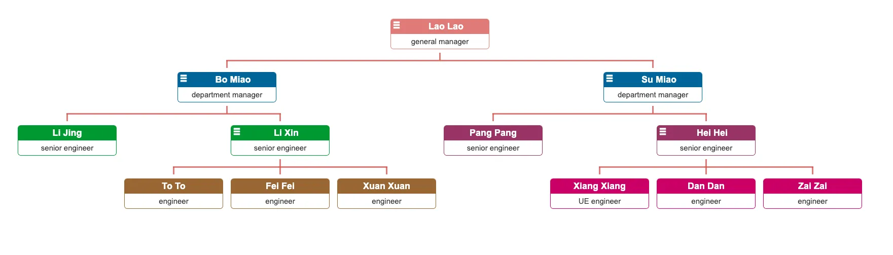 { 'name': 'Bo Miao', 'title': 'department manager' },