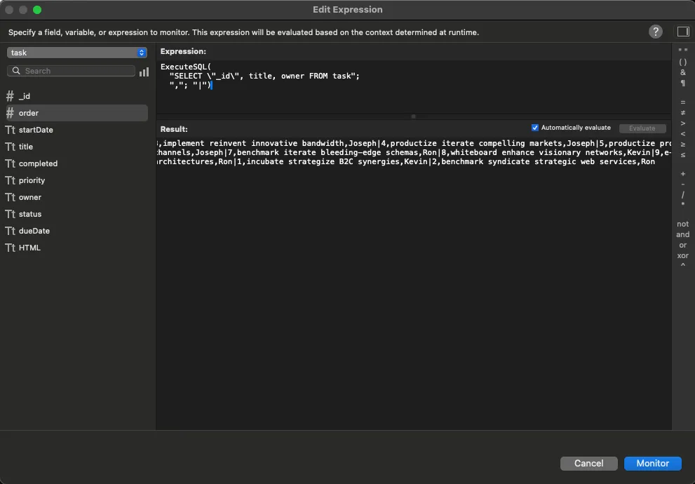 Note the use of | for the row separator instead of the default ¶. I had trouble parsing ¶ in JavaScript, so I chose the pipe character for the row separator. Click Monitor to save this expression to use in a few more steps.