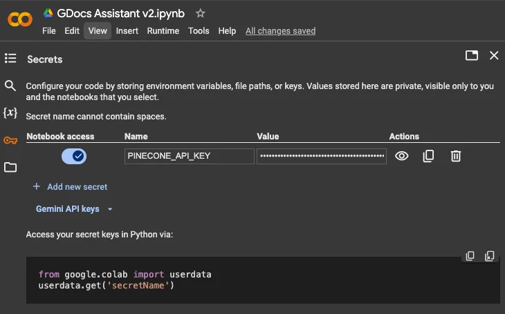 Then open up a new Google Colab project and save the key in the Secrets manager. Name the variable PINECONE_API_KEY, paste in the value, and then turn on the Notebook access setting to enable it.