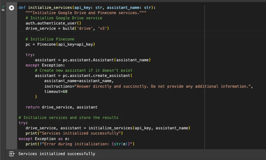 You should see the Services initialized successfully message. You can now connect to Google Drive and Pinecone.