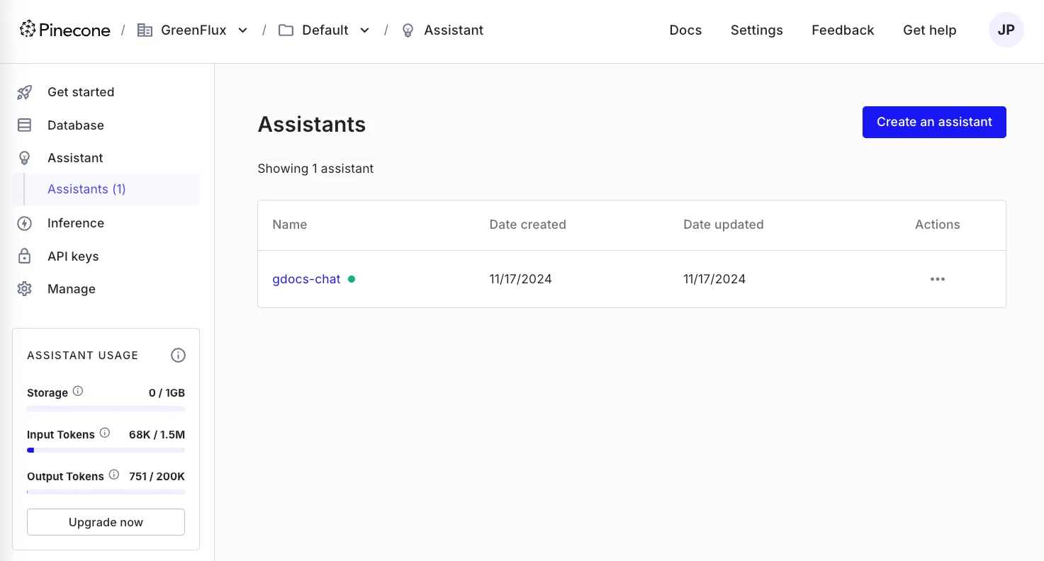 Head back to Pinecone and refresh the page. You should see the new Assistant in your account.