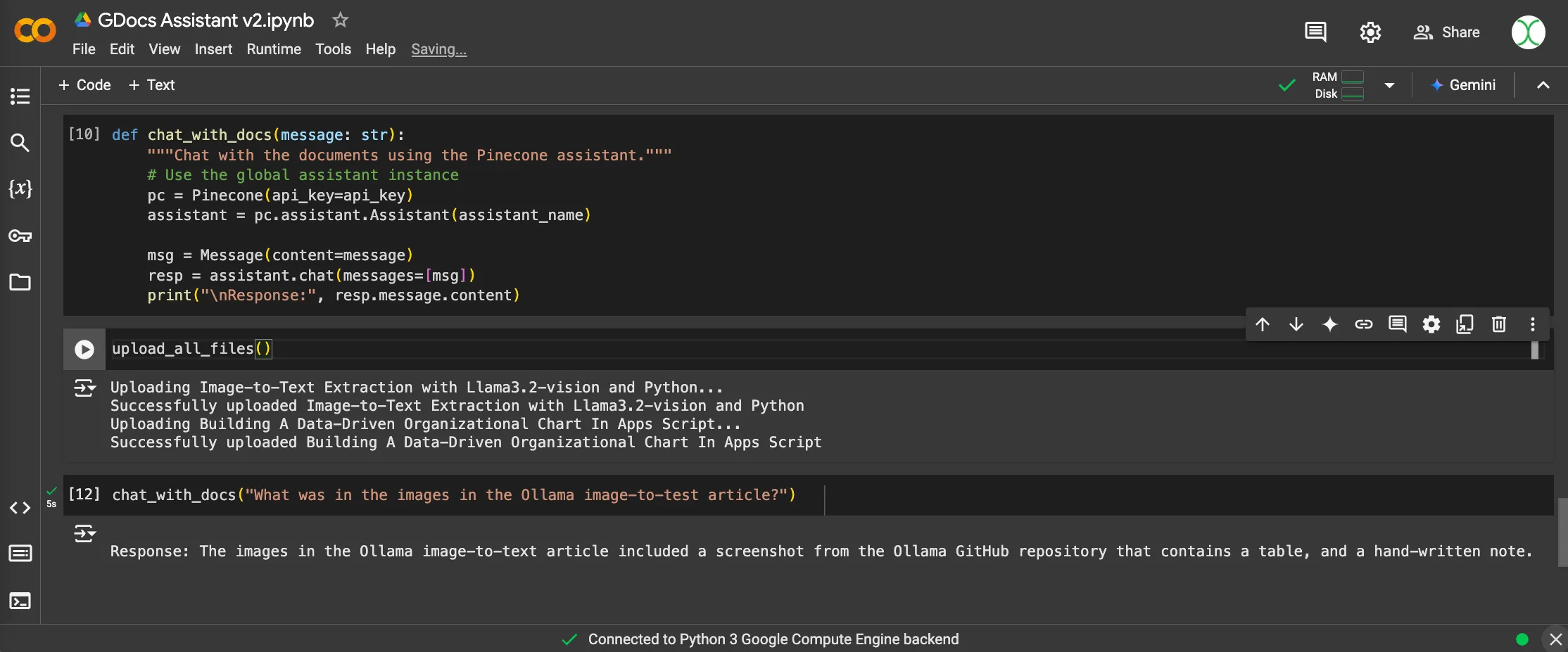 Pinecone’s Assistants make it easy to upload files for retrieval augmented generation, enabling chat apps with access to your data, and providing more accurate results that are specific to your use case. With just a few Python functions you can build a complete RAG chat app that’s grounded on your own Google Docs data.