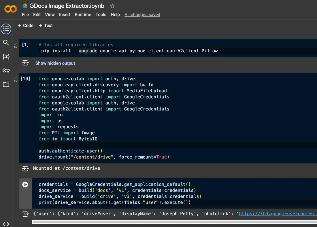 Google makes it as easy as possible to add new images to a Google Doc, with options like drag-and-drop, paste from clipboard, insert from Drive/URL, etc. But they make it surprisingly hard to get the images back out! I’ve written about this before [blog post], but that was before I started learning Python. So I wanted to follow up with this new guide using Google Colab and the Drive Python SDK to add one more method to the list.