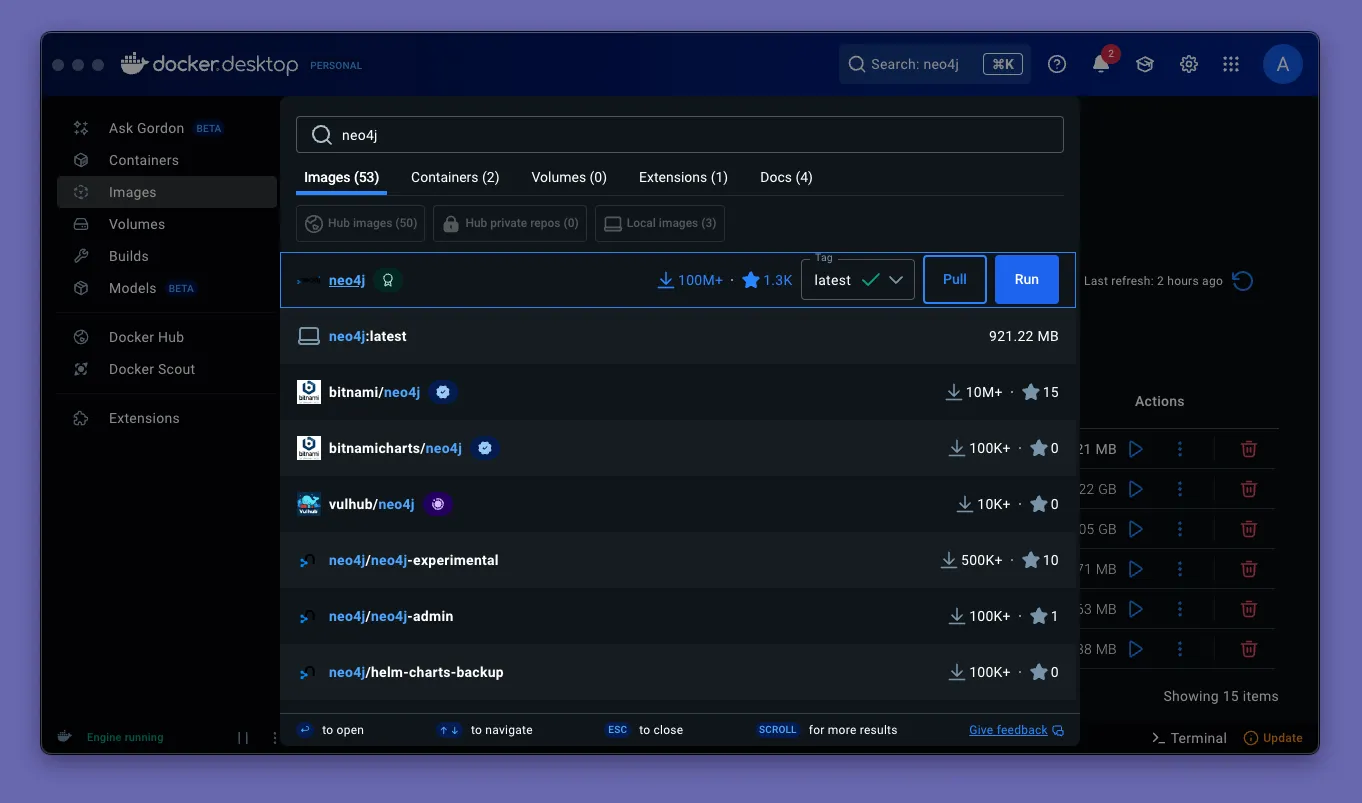Start out by installing Docker Desktop if not already installed. Then open it and go to the Images section. Type neo4j in the search, then click Run on the top result.