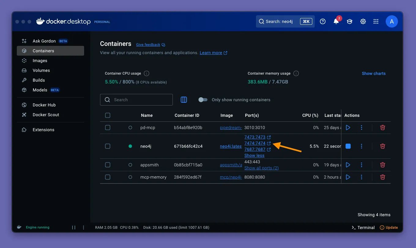 Give the container a minute to start up, then select the Containers section on the left. Click Show all ports on the Neo4j container, then click to open the web console on port 7474.