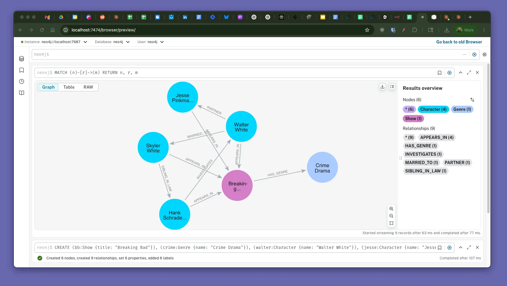 You should see the new node and relationship types appear on the left sidebar. Now run a query to show all the nodes and relationships.
