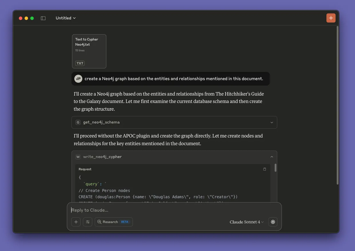 Once the file is attached, ask Claude to create a Neo4j graph based on the entities and relationships in the document.