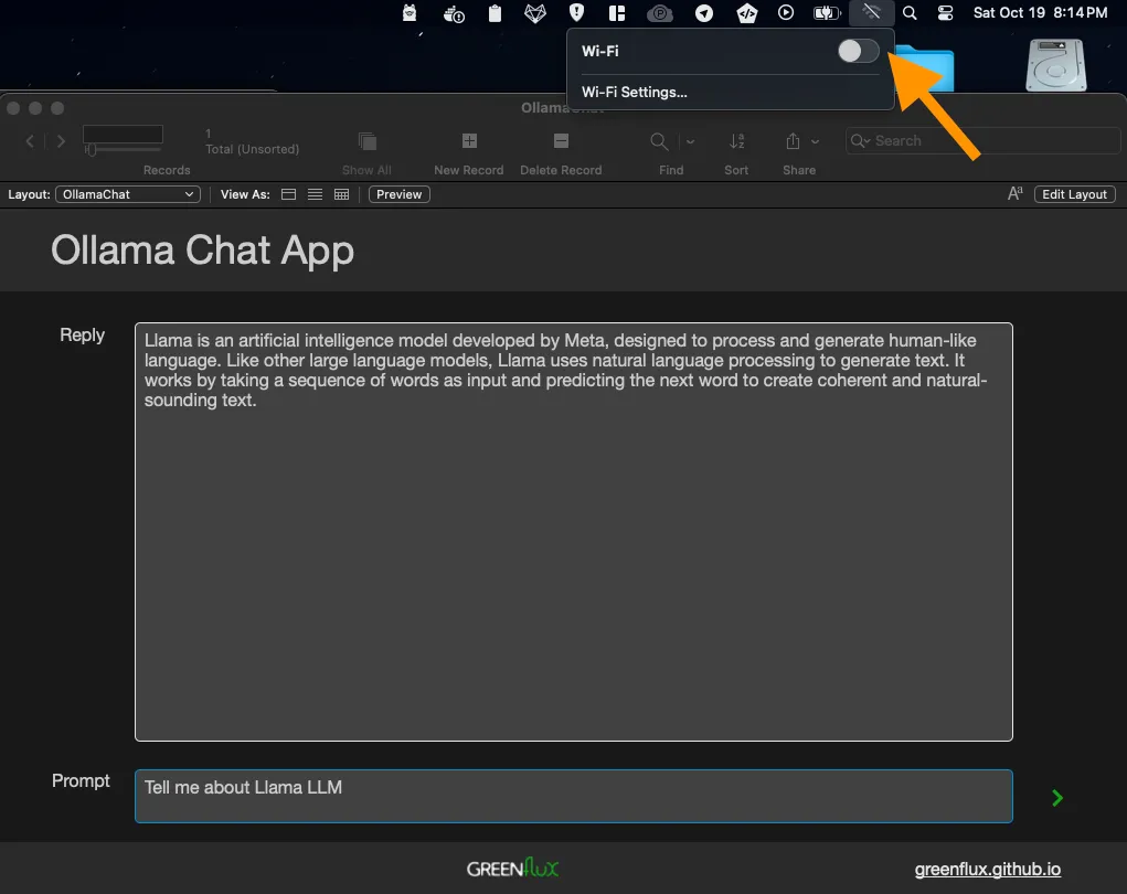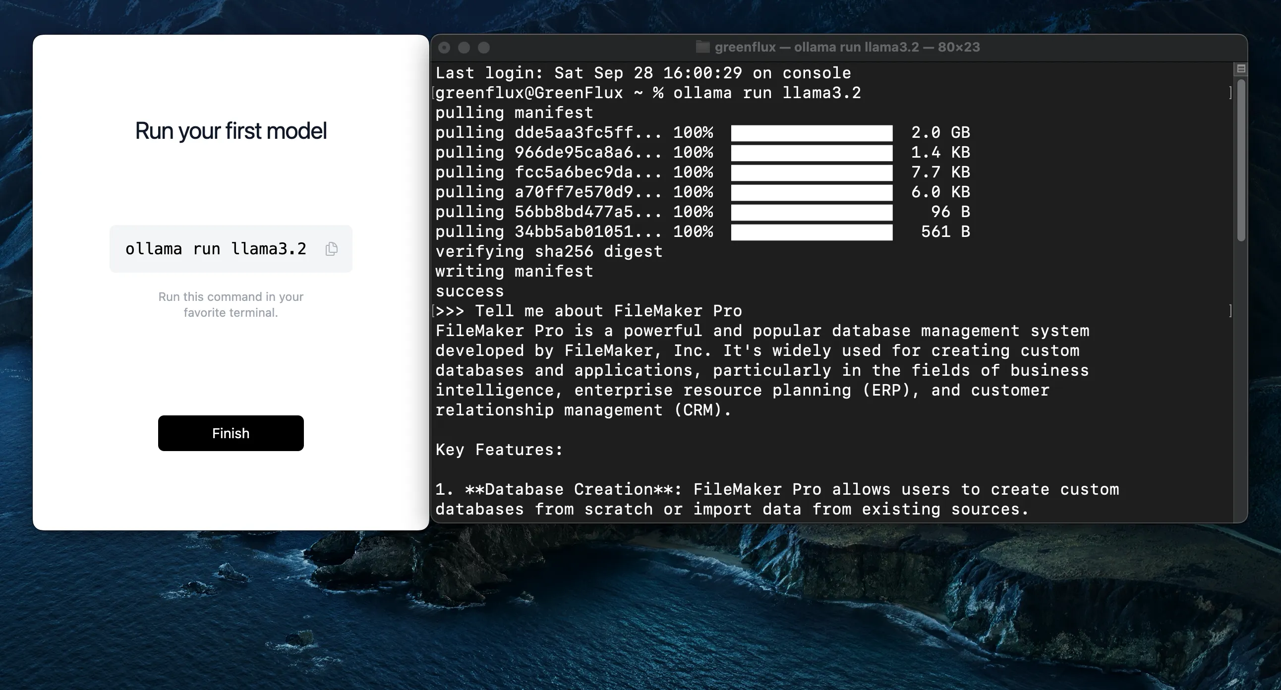 In this guide, I’ll show you how to set up your own self-hosted, local LLM that works completely offline, and integrate it with FileMaker Pro. We’ll be using the Ollama client for Mac, and downloading the Llama3.2 model. No special hardware is needed. I’m running this on my M1 Macbook with no issues, and I’m able to quickly get an AI response in FileMaker, all without sending any data away from my machine.