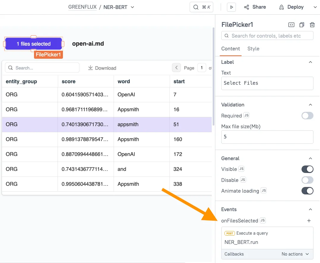 You can also set the FilePicker to run the NER_BERT query when a new file is uploaded, using the onFileSelected event.