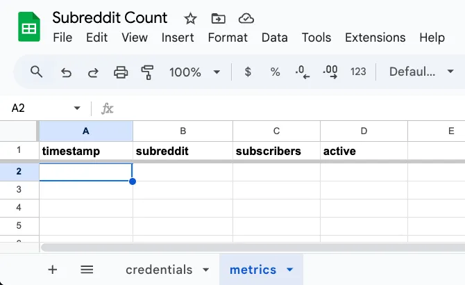 Lastly we’ll add a function to pull some metrics about a subreddit, and save it to a new sheet. Create a metrics sheet and add columns for timestamp, subreddit, subscribers, and active_users.