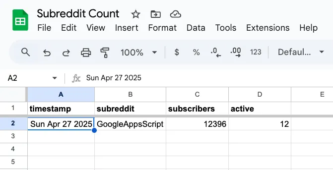 Save and run the function, and approve the new permissions if needed. You should now see a new row logged from the Reddit API.